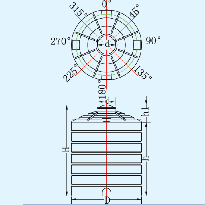 3、PE塑料水箱上面有四个向上的平面,下面有四个成十字形分布的侧面平面,可从四个不同的方向安装进水口、出水口、排液口和其他管道。