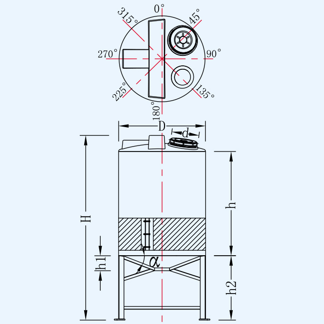 | 名称 | 型号 | 容量L | 桶体直径D | 人孔直径d | 含脚总高H | 垂高h | 锥高h2 | 脚高h1 | 平均厚度mm |