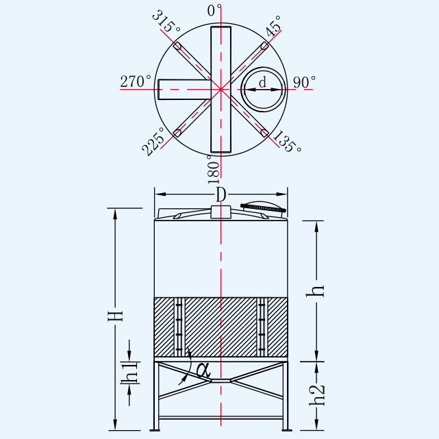| 名称 | 型号 | 容量L | 桶体直径D | 人孔直径d | 含脚总高H | 垂高h | 锥高h2 | 脚高h1 | 平均厚度mm |