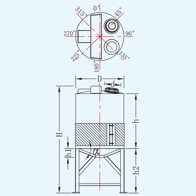 | 名称 | 型号 | 容量L | 桶体直径D | 人孔直径d | 含脚总高H | 垂高h | 锥高h2 | 脚高h1 | 平均厚度mm |