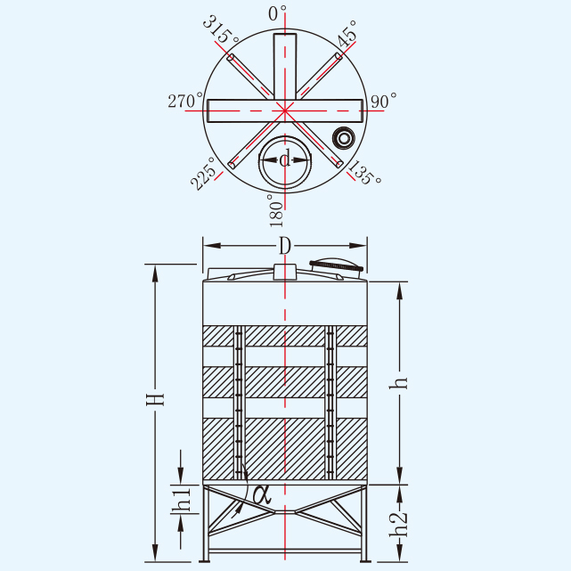 | 名称 | 型号 | 容量L | 桶体直径D | 人孔直径d | 含脚总高H | 垂高h | 锥高h2 | 脚高h1 | 平均厚度mm |