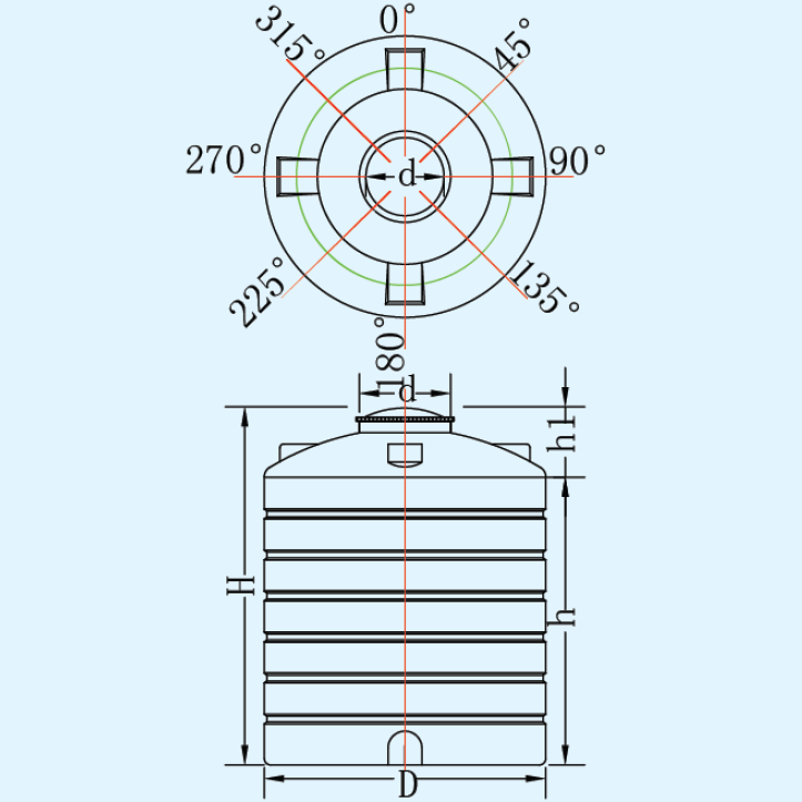 | 名称 | 型 号 | 容量L | 桶体D | 人孔d | 垂高h | 总高H |