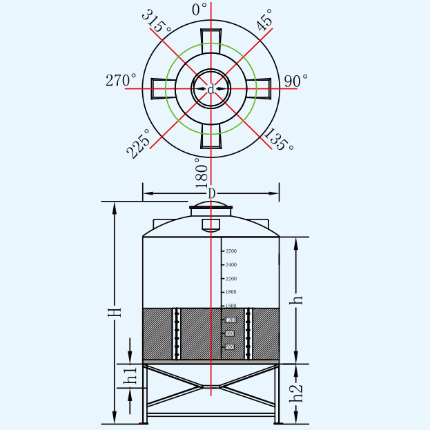 名称 型号 容量L 桶体直径D 人孔直径d 含脚总高度H 垂高h 锥高h1 脚高h2 平均厚度mm