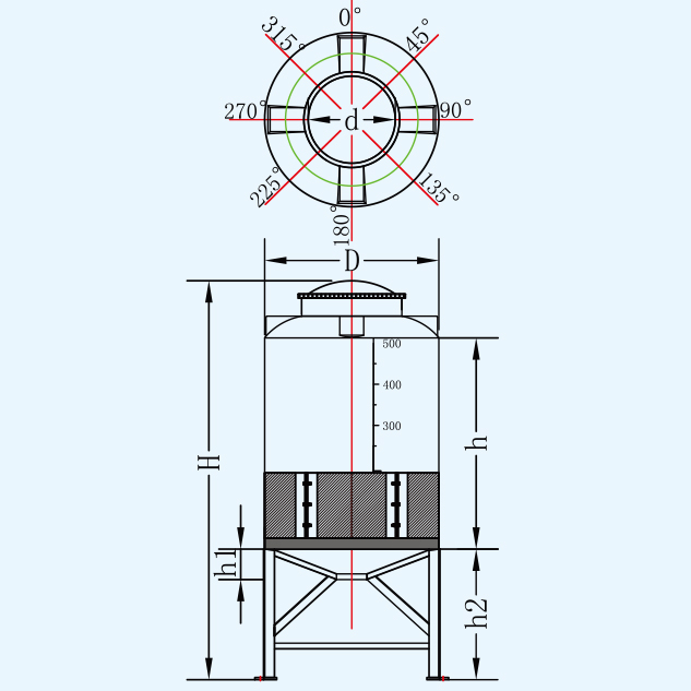 | 名称 | 型号 | 容量L | 桶体直径D | 人孔直径d | 总脚高度H | 垂高h | 脚高h1 | 锥高h2 | 平均厚度mm |